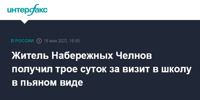 Москва. 18 мая. INTERFAX.RU - В Набережных Челнах суд арестовал на трое суток горожанина, который 17 мая пришел в школу пьяным и неадекватно себя вел, сообщили в МВД Татарстана. Ему вменили появление в общественном месте в нетрезвом состоянии (ст.20.21 КоАП).