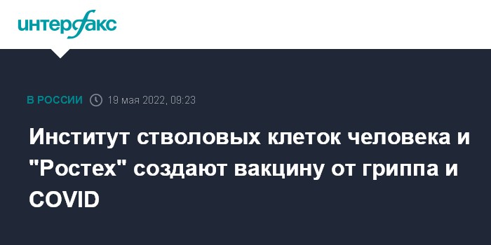 Москва. 19 мая. INTERFAX.RU - Холдинг "Нацимбио" госкорпорации "Ростех" и Институт стволовых клеток человека (ИСКЧ) заключили соглашение о создании комбинированной вакцины против гриппа и коронавируса, клинические исследования препарата начнутся во второй половине 2022 года, сообщили в пресс-службе госкорпорации.