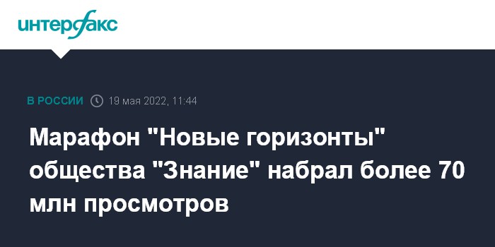 Москва. 19 мая. INTERFAX.RU - Трансляции просветительского марафона "Новые горизонты", организованного российским обществом "Знание", набрали более 70 миллионов просмотров за два дня работы, сообщила в четверг пресс-служба организации.