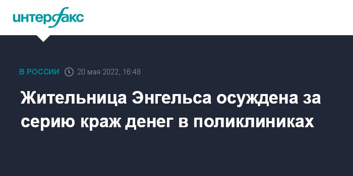 Москва. 20 мая. INTERFAX.RU - В Саратове Кировский суд отправил на два года в колонию общего режима 47-летнюю жительницу Энгельса за серию краж денег у пациентов поликлиник, сообщила областная прокуратура.