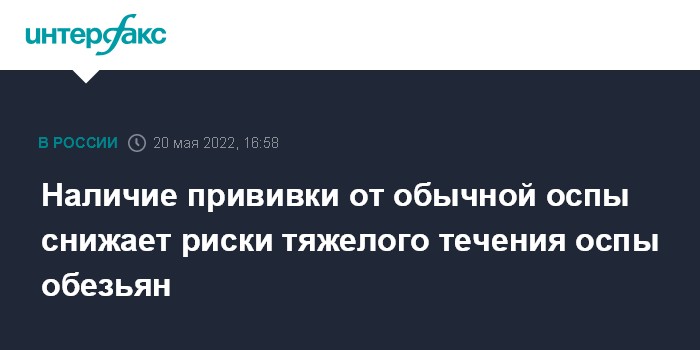 Москва. 20 мая. INTERFAX.RU - Наличие вакцинации от натуральной оспы в прошлом может способствовать менее тяжелому течению заболевания оспой обезьян, вирус обычно передается человеку от диких животных, случаи передачи от человека к человеку носят ограниченный характер, заявили в Роспотребнадзоре.