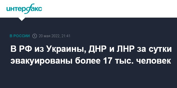 Москва. 20 мая. INTERFAX.RU - В течение минувших суток на территорию России из Донецкой и Луганской народных республик, украинских населенных пунктов вывезены свыше 17 тысяч человек. Об этом сообщил начальник Национального центра управления обороной РФ Михаил Мизинцев на брифинге в пятницу.