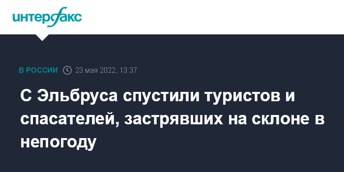 Москва. 23 мая. INTERFAX.RU - В Кабардино-Балкарии завершилась эвакуация с Эльбруса четырех туристов и 11 спасателей, которые застряли на склоне из-за ухудшения погоды, сообщили "Интерфаксу" в оперативной дежурной смене Эльбрусского высокогорного поисково-спасательного отряда. Там заверили, что никто не пострадал.