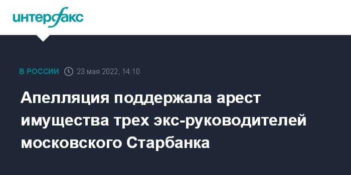 Москва. 23 мая. INTERFAX.RU - Девятый арбитражный апелляционный суд 19 мая оставил в силе определение Арбитражного суда Москвы, который 25 февраля по заявлению Агентства по страхованию вкладов (АСВ, конкурсный управляющий) арестовал имущество, включая денежные средства, троих бывших руководителей московского Старбанка на сумму 15,2 млрд рублей у каждого.