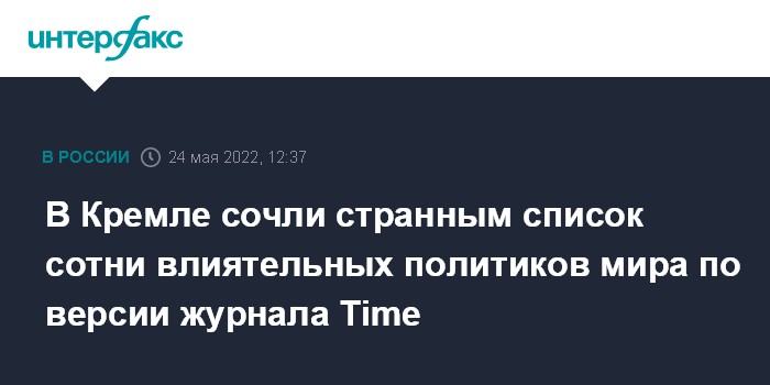 Москва. 24 мая. INTERFAX.RU - В Кремле назвали странной позицию американского журнала Time, опубликовавшего список 100 самых влиятельных политиков мира, где текст о президенте Владимире Путине написал оппозиционер Алексей Навальный, а о президенте Украины Владимире Зеленском - Джо Байден.