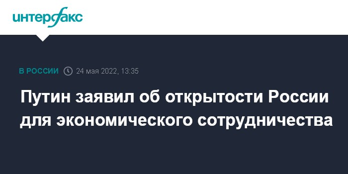 Москва. 24 мая. INTERFAX.RU - Президент Владимир Путин заявил, что несмотря на санкции, Россия намерена оставаться открытой для экономического сотрудничества со всеми странами мира, более того, будет расширять взаимодействие со странами, которые заинтересованы в сотрудничестве.