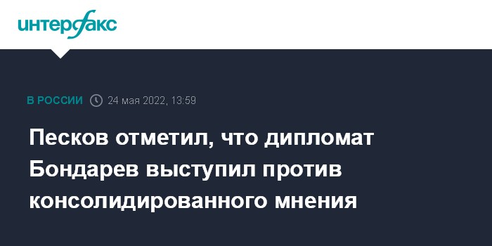 Песков отметил, что дипломат Бондарев выступил против консолидированного мнения