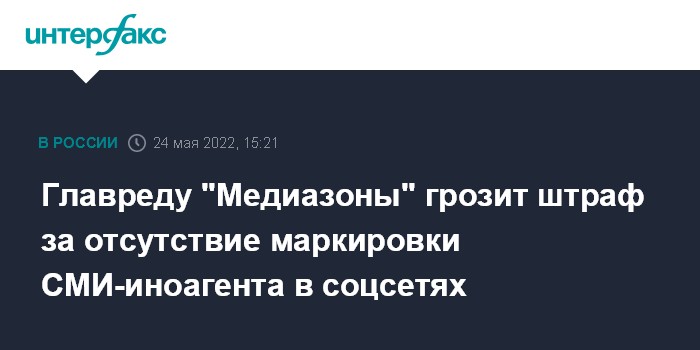 Москва. 24 мая. INTERFAX.RU - Роскомнадзор составил протокол на главного редактора издания "Медиазона" (внесена Минюстом РФ в реестр СМИ-иноагентов) Сергея Смирнова (внесен в реестр СМИ-иноагентов) из-за отсутствие предусмотренной для иноагентов маркировки в его постах в Telegram и на видеохостинге YouTube.