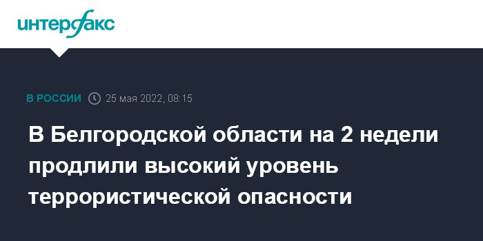 Москва. 25 мая. INTERFAX.RU - Губернатор Белгородской области Вячеслав Гладков сообщил о продлении действующего в регионе "желтого" (высокого) уровня террористической опасности еще на две недели.