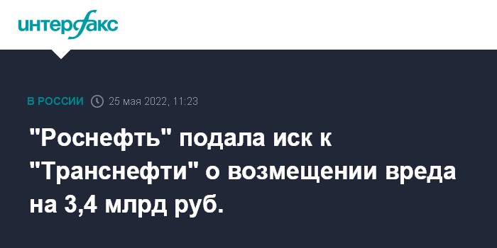 Москва. 25 мая. INTERFAX.RU - "Роснефть" подала в Арбитражный суд Москвы иск к "Транснефти" на 3,361 млрд рублей, следует из судебной картотеки.