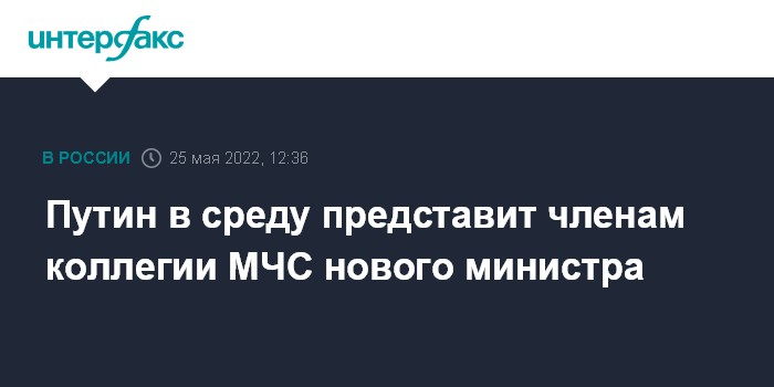 Москва. 25 мая. INTERFAX.RU - Президент РФ Владимир Путин в среду посетит Национальный центр управления в кризисных ситуациях МЧС России, чтобы представить членам коллегии ведомства нового министра Александра Куренкова, сообщил пресс-секретарь главы государства Дмитрий Песков.