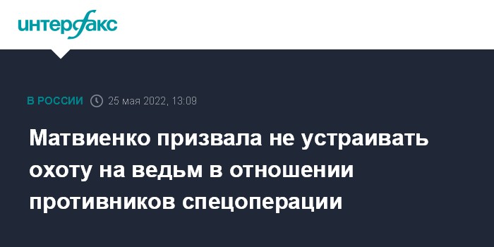 Москва. 25 мая. INTERFAX.RU - Спикер Совета Федерации Валентина Матвиенко призвала не устраивать охоту на ведьм в отношении тех, кто заявил о несогласии с российской спецоперацией на Украине, так как общество само даст оценку.