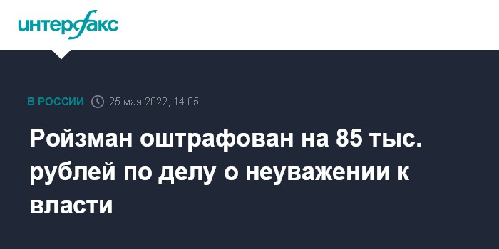 Как сообщалось, в конце апреля в отношении Ройзмана был составлен протокол по ч.3 ст. 20.1 КоАП РФ (распространение в сети информации, которая оскорбляет человеческое достоинство и общественную нравственность, явное неуважение к обществу, государству или органам, осуществляющим государственную власть в РФ). Поводом стал его комментарий в одной из соцсетей к новости с заявлениями главы МИД РФ Сергея Лаврова. По данной статье ему грозил штраф от 30 до 100 тыс. рублей.