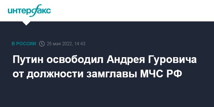 Москва. 25 мая. INTERFAX.RU - Президент РФ Владимир Путин освободил от должности замглавы МЧС РФ Андрея Гуровича. Соответствующий указ опубликован на официальном портале правовой информации в среду.