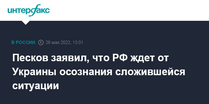 На вопрос журналистов, каких уступок от Украины ожидает Россия, пресс-секретарь президента РФ Дмитрий Песков ответил, что Москва ждет от Киева принятия ее требований и "осознания ситуации де-факто - реальной ситуации, которая существует".