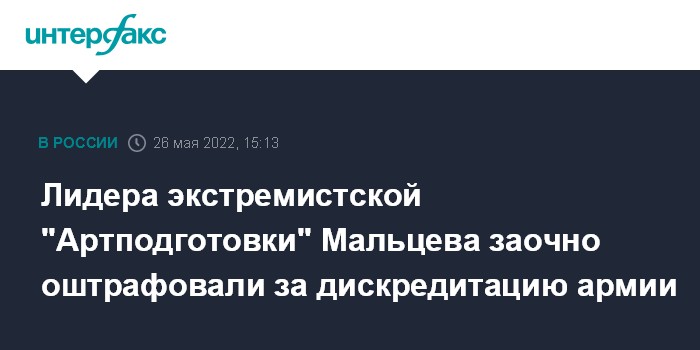 "Постановлением суда Мальцев оштрафован на 50 тыс. рублей по ч.2.ст 20.3.3 КоАП РФ (публичные действия, направленные на дискредитацию использования Вооруженных Сил Российской Федерации)", - сказал собеседник агентства.