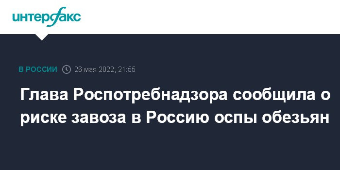 Москва. 26 мая. INTERFAX.RU - Существуют риски завоза в Россию оспы обезьян, но они невелики, заявила телеканалу "Россия 1" глава Роспотребнадзора Анна Попова.
