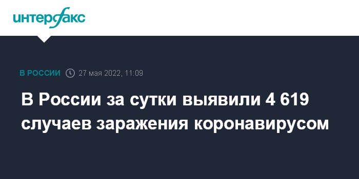 Москва. 27 мая. INTERFAX.RU - Суточный прирост новых заболевших коронавирусной инфекцией в РФ составил 4 619 случаев, следует из данных оперативного штаба, обнародованных в пятницу.