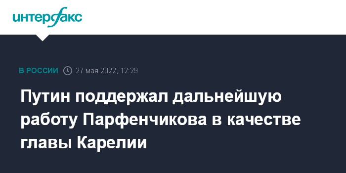 Москва. 27 мая. INTERFAX.RU - Президент РФ Владимир Путин поддержал дальнейшую работу Артура Парфенчикова на посту главы Карелии.