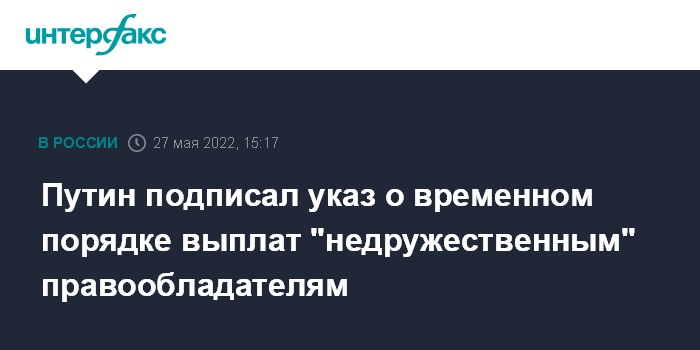 Москва. 27 мая. INTERFAX.RU - Президент РФ Владимир Путин подписал указ "О временном порядке исполнения обязательств перед некоторыми правообладателями".