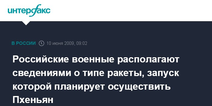 Москва. 10 июня. INTERFAX.RU - В российском военном ведомстве есть данные о намерении Северной Кореи осуществить запуск баллистической ракеты, заявил в среду "Интерфаксу-АВН" высокопоставленный источник в Генштабе ВС РФ.
