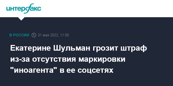 В минувшую пятницу, 27 мая, Шульман в стриме с оппозиционером Ильей Яшиным сообщила о составлении РКН в отношении неё протокола за отсутствие маркировки. По ее словам, она консультируется с юристами относительно этой ситуации, а также находится в процессе создания требуемого законом юридического лица. Она отметила, что всегда была законопослушным человеком и ей бы не хотелось лишний раз давать повод для привлечения её к уголовной ответственности за нарушение российского законодательства об иностранных агентах.