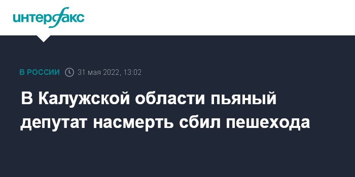 Москва. 31 мая. INTERFAX.RU - Депутата собрания Хвастовичского района Калужской области задержали по подозрению в совершении "пьяного" ДТП, в котором погиб 23-летний пешеход. Об этом сообщила пресс-служба регионального следственного управления СКР.