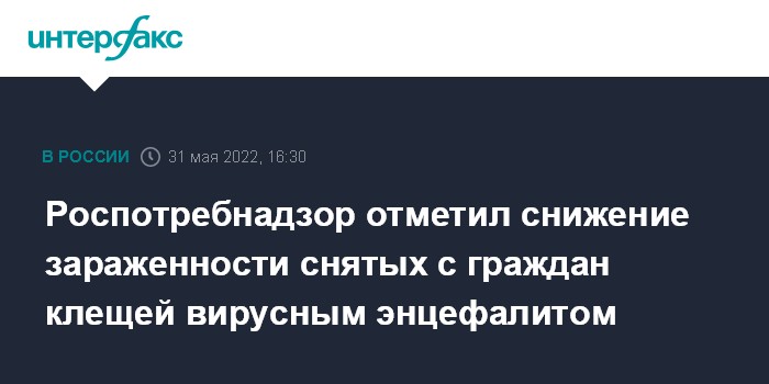 Москва. 31 мая. INTERFAX.RU - Зараженность снятых с граждан после укусов клещей вирусным энцефалитом составила 1,35%, что значительно ниже среднемноголетних значений, сообщили в Роспотребнадзоре.