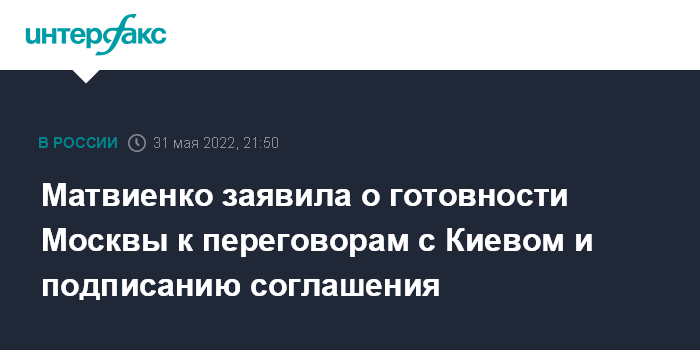 Москва. 31 мая. INTERFAX.RU - Россия готова продолжить переговоры с Украиной для достижения мирного соглашения, заявила спикер Совета Федерации Валентина Матвиенко.