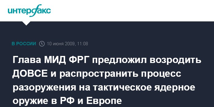 Москва. 10 июня. INTERFAX.RU - Вице-канцлер, глава МИД ФРГ Франк-Вальтер Штайнмайер предлагает включить в процесс разоружения тактическое ядерное оружие в России и Европе и возродить Договор об обычных вооруженных силах в Европе (ДОВСЕ).