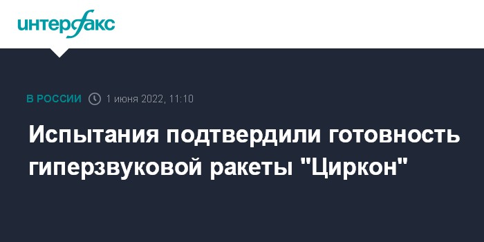 Москва. 1 июня. INTERFAX.RU - Российские военные сообщили о завершении цикла испытаний морской гиперзвуковой ракеты "Циркон", готовность этого типа нового оружия подтверждена.
