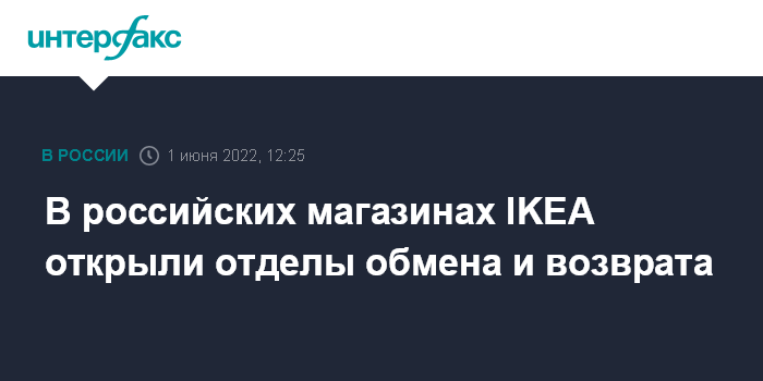 Москва. 1 июня. INTERFAX.RU - Отделы обмена и возврата открылись с 1 июня в ранее закрытых российских магазинах IKEA, сообщается на сайте компании.