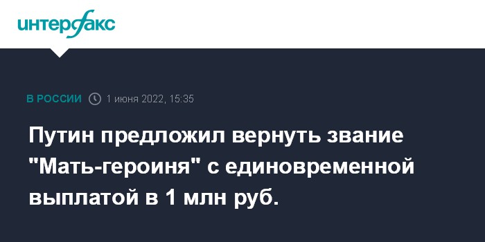 Москва. 1 июня. INTERFAX.RU - Президент РФ Владимир Путин поддержал идею вернуть звание "Мать-героиня" и предложил выплачивать за его присвоение 1 млн рублей.