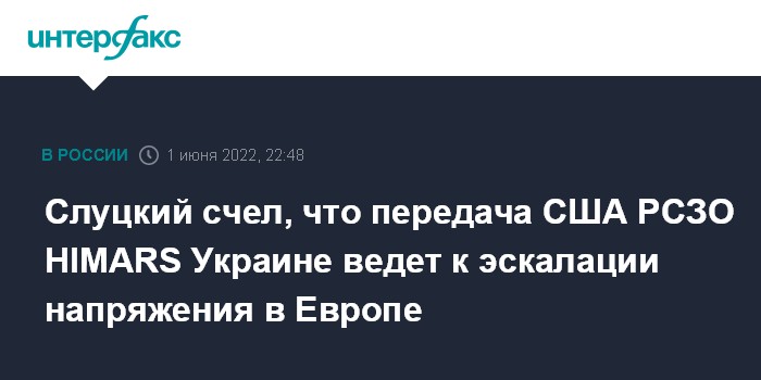 Москва. 1 июня. INTERFAX.RU - Передача Пентагоном Украине реактивных систем залпового огня (РСЗО) HIMARS ведет к эскалации напряжения в Европе, заявил председатель комитета Госдумы по международным делам Леонид Слуцкий.