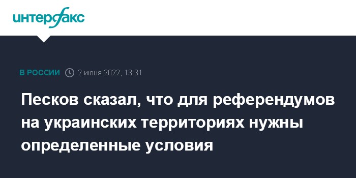 Москва. 2 июня. INTERFAX.RU - Для проведения референдумов в ЛНР, ДНР, Херсонской области и Запорожье об их вхождении в состав РФ необходимы определенные условия и желание жителей этих территорий, заявил пресс-секретарь президента РФ Дмитрий Песков.