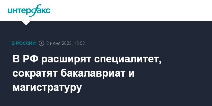 "Количество специалитета сократилось с 20% в 2016 году почти до 13% к 2021 году, хотя запрос на подготовку специалистов по специалитету достаточно высок. (...) До 2023 года у нас произойдет изменение пропорций в соотношении программ специалитета, бакалавриата и магистратуры", - сказал Фальков в четверг журналистам после заседания Российского союза ректоров, где обсуждался вопрос перехода от Болонской системы высшего образования.