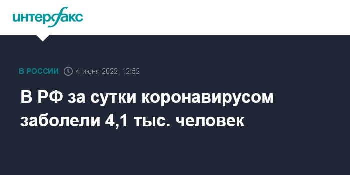Москва. 4 июня. INTERFAX.RU - Суточный прирост новых заболевших коронавирусной инфекцией в России составил 4 101 случай, следует из данных оперативного штаба, обнародованных в субботу.