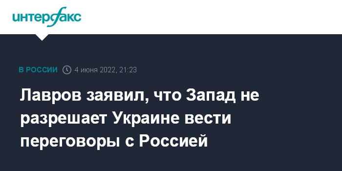 Москва. 4 июня. INTERFAX.RU - Запад запретил Киеву продолжать переговорный процесс с Москвой, заявил глава МИД РФ Сергей Лавров.