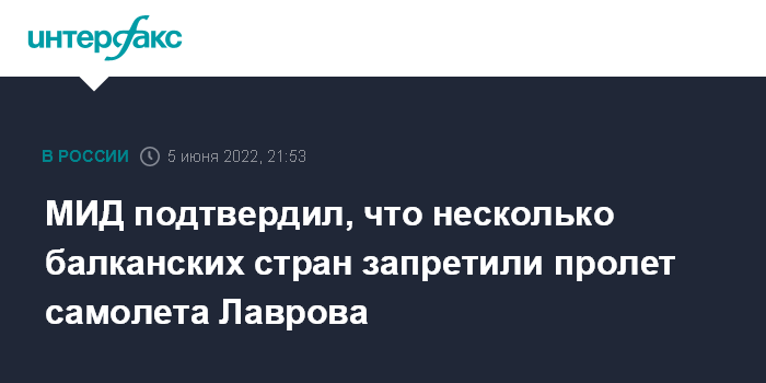 Москва. 5 июня. INTERFAX.RU - МИД России подтверждает, что Болгария, Северная Македония и Черногория не дали разрешения на пролет самолета главы МИД РФ Сергея Лаврова, который 6-7 июня должен был посетить Белград.