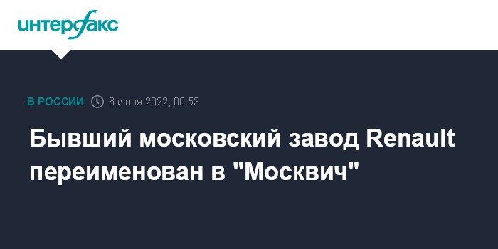 Москва. 6 июня. INTERFAX.RU - Бывший российский автозавод французского концерна Renault, переданный в управление Москве в мае текущего года, переименован из ЗАО "Рено Россия" в АО "Московский автомобильный завод "Москвич", следует из данных ЕГРЮЛ.