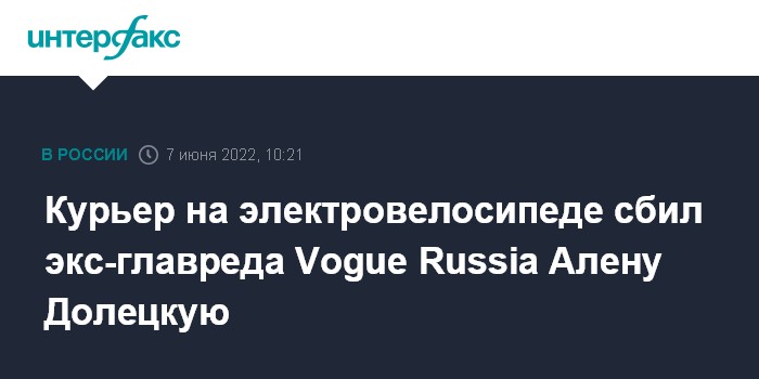 Москва. 7 июня. INTERFAX.RU - Курьер на электровелосипеде сбил экс-главреда журналов Vogue Russia и Interview Russia Алену Долецкую и ее ассистента.