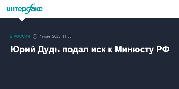 Москва. 7 июня. INTERFAX.RU - Журналист Юрий Дудь, признанный в России СМИ-иноагентом, подал иск к Минюсту РФ.