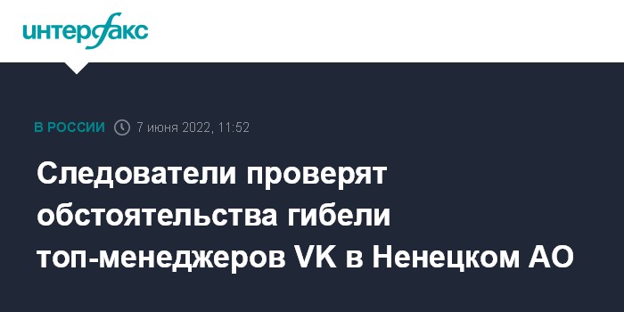 Ранее во вторник компания VK сообщила о гибели в результате происшествия в НАО топ-менеджеров Владимира Габриеляна и Сергея Мерзлякова.
