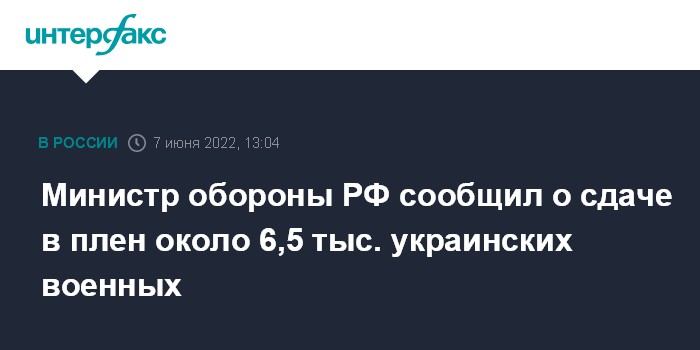 Москва. 7 июня. INTERFAX.RU - Общее количество плененных украинских военнослужащих достигло 6489 человек, сообщил министр обороны РФ Сергей Шойгу.