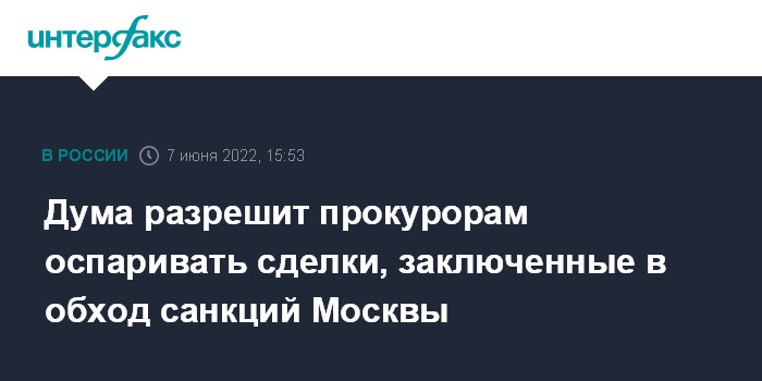 Москва. 7 июня. INTERFAX.RU - Госдума приняла во втором чтении законопроект № 1192314-7 о праве прокуроров просить суды признать недействительными сделки, совершенных с нарушением объявленных Россией санкций.