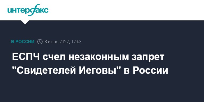 Москва. 8 июня. INTERFAX.RU - Европейский суд по правам человека (ЕСПЧ) расценил как нарушение конвенции о правах человека ликвидацию российских "Свидетелей Иеговы" (признаны в России экстремистской организацией и запрещены Верховным судом). Такое решение опубликовано на сайте Страсбургского суда.