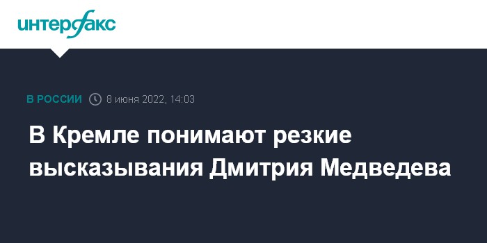 Москва. 8 июня. INTERFAX.RU - Резкие эмоциональные оценки внешнеполитической ситуации в публикациях замглавы Совбеза Дмитрия Медведева в Telegram "вполне объяснимы", считает пресс-секретарь президента Дмитрий Песков.