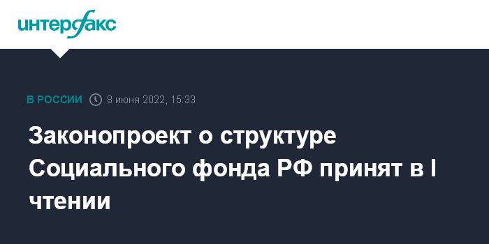 Москва. 8 июня. INTERFAX.RU - Госдума приняла в первом чтении законопроект о создании с 1 января 2023 года государственного внебюджетного Фонда пенсионного и социального страхования (Социальный фонд РФ, СФР), который объединит функции и имущество Пенсионного фонда и Фонда социального страхования.