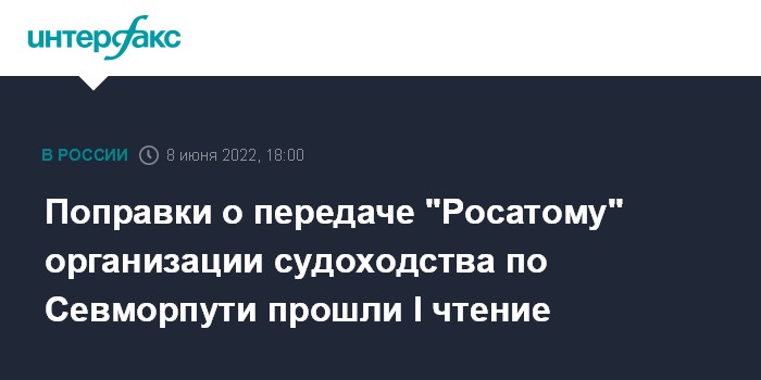 Москва. 8 июня. INTERFAX.RU - Госдума приняла в первом чтении правительственный законопроект № 135971-8, который централизует в "Росатоме" полномочия по управлению судоходством в акватории Северного морского пути (СМП).