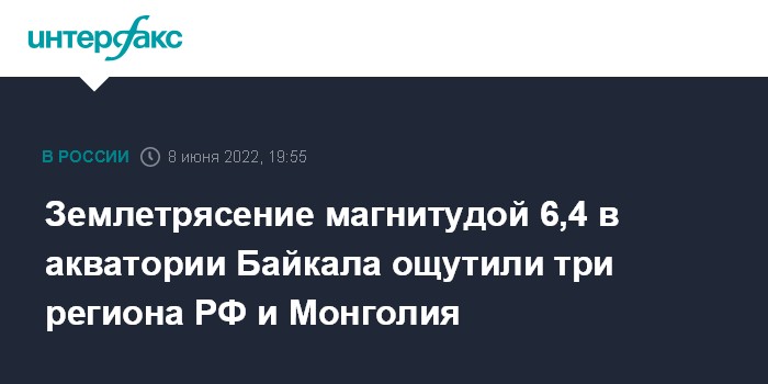 Москва. 8 июня. INTERFAX.RU - Подземный толчок магнитудой 6,4 энергетическим классом 15, произошедший вечером в среду в акватории озера Байкал, ощущался на территории Иркутской области, республики Бурятия и Забайкальского края, сообщается на сайте Байкальского филиала Единой геофизической службы РАН.